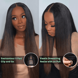 The Yaki Straight V Part Wig allows you to wear your own real part with no leave out and no lace. Unlike a u part wig, there is no weft to try to cover up. Unlike a lace wig, there are no little lace holes to try to conceal.