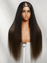 The Yaki Straight V Part Wig allows you to wear your own real part with no leave out and no lace. Unlike a u part wig, there is no weft to try to cover up. Unlike a lace wig, there are no little lace holes to try to conceal.