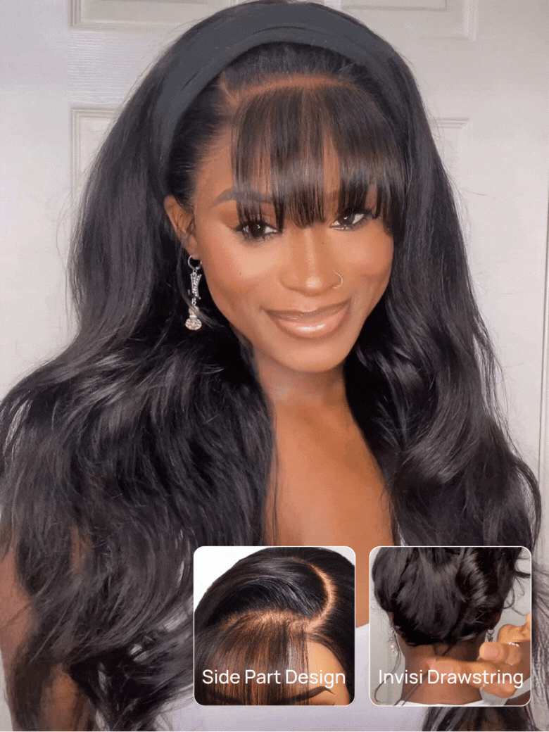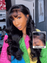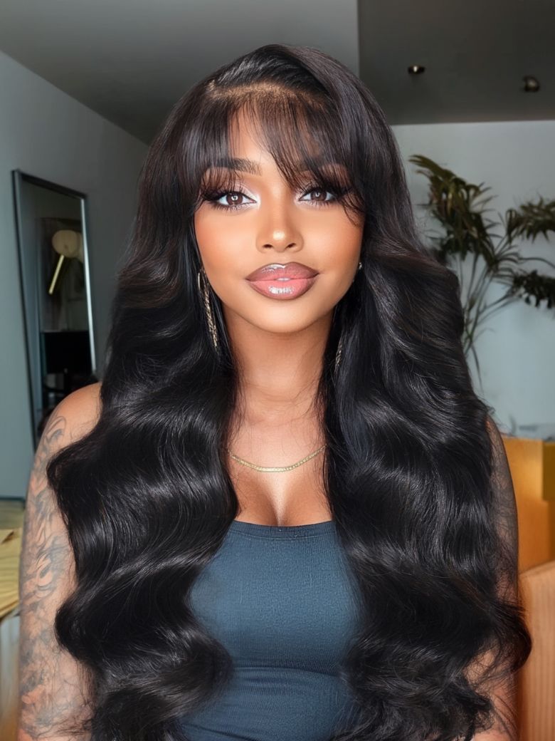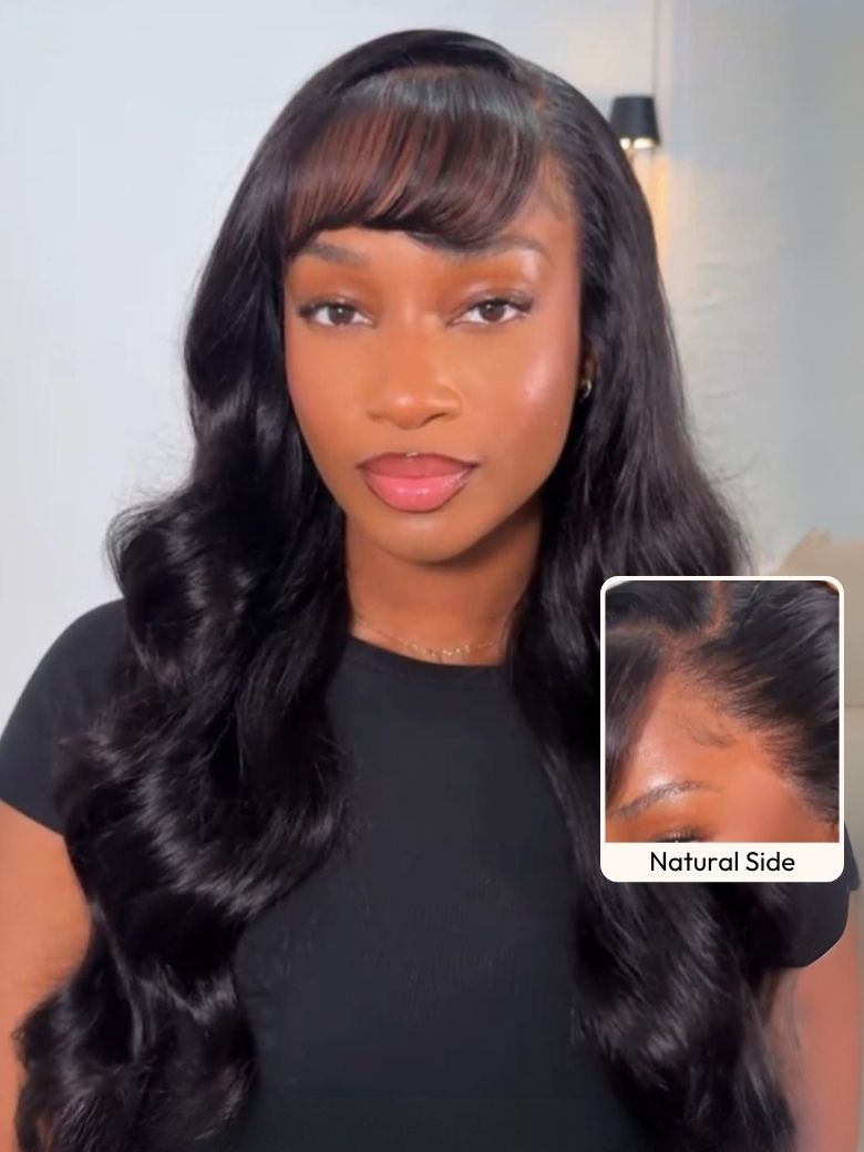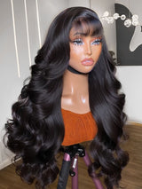 Home | Klaiyi 13x4 Pre everything™ Lace Frontal Fluffy Natural Loose Body Wave With Vintage Air Bangs Put on and Go Glueless Human Hair Wigs